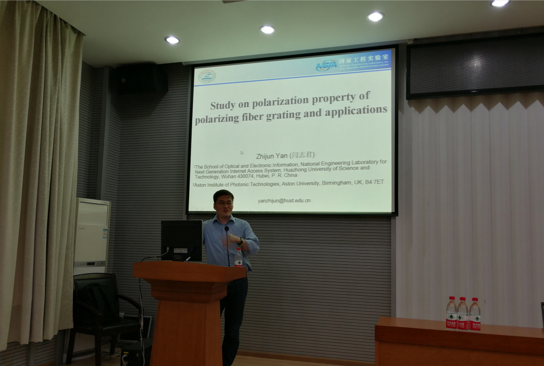 应beat365唯一官方网站院长丁华锋教授及科发院邀请,华中科技大学光学与电子信息学院闫志君博士于10月9号来我院作题为“倾斜光纤光栅偏振特性及其应用”学术报告。