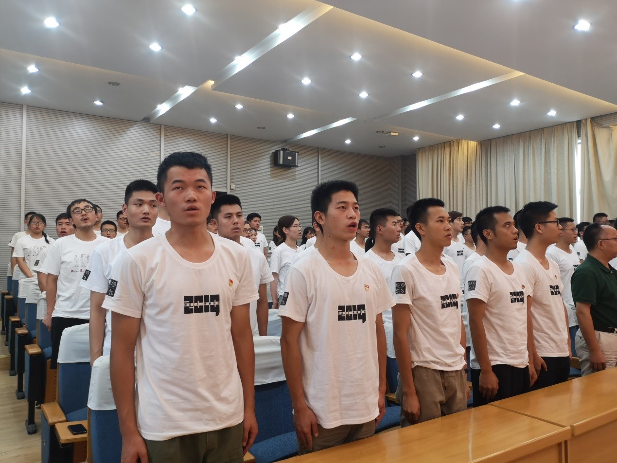全体起立、奏唱国歌;在毕业生党员梅天穹同志的带领下,全体党员面向党旗、重温入党誓词。