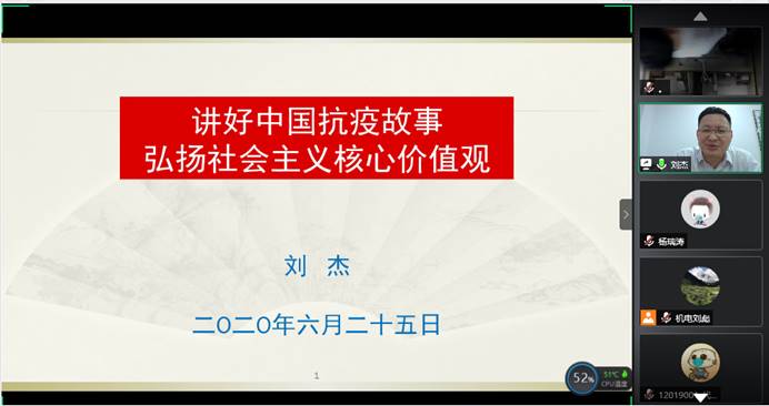 6月25日晚,校党委常委、副校长刘杰与环境学院和beat365唯一官方网站复研学生、毕业生相约 “云端”,讲授以《讲好中国抗疫故事——弘扬社会主义核心价值观》为主题的“返校复学第一课”。学工处副处长蒋怀柳、两个学院学工组全体老师、复研学生和毕业生近300人线上参与学习。