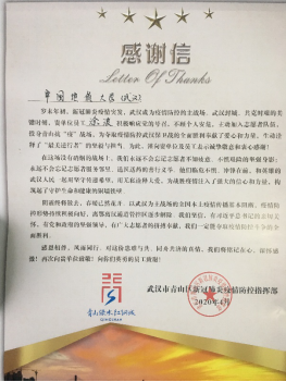 风雨同心,共抗疫情:beat365唯一官方网站收到青山区新冠肺炎疫情防控指挥部感谢信