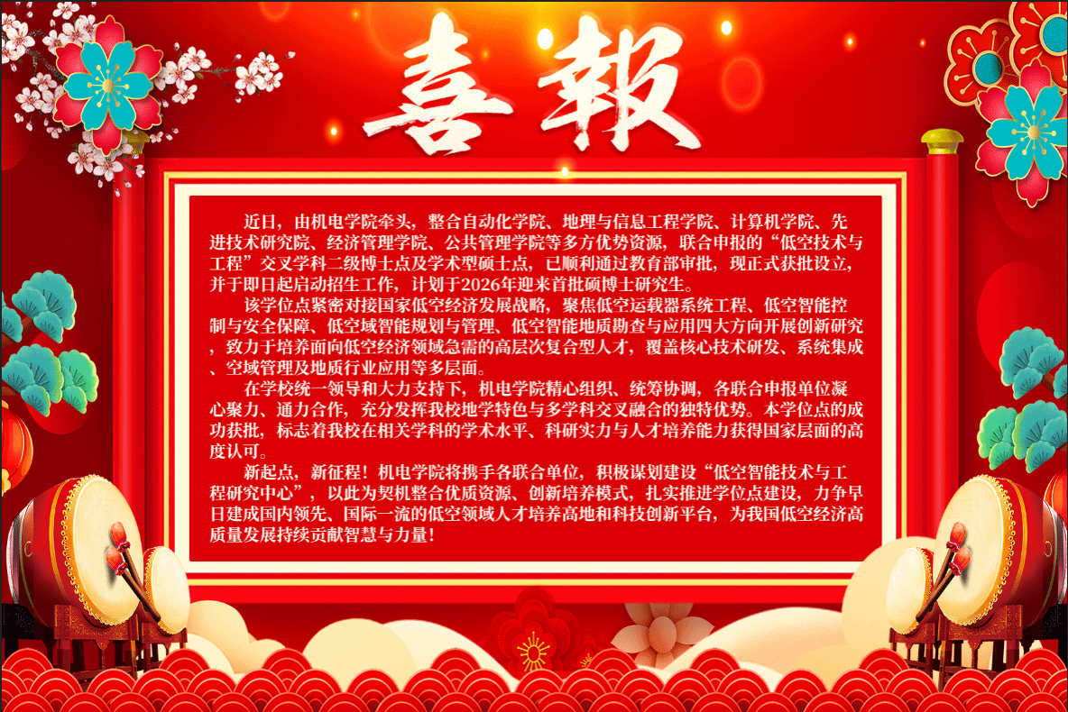 近日,由beat365唯一官方网站牵头,整合自动化学院、地理与信息工程学院、计算机学院、先进技术研究院、经济管理学院、公共管理学院等多方优势资源,联合申报的“低空技术与工程”交叉学科二级博士点及学术型硕士点,已顺利通过教育部审批,现正式获批设立,并于即日起启动招生工作,计划于2026年迎来首批硕博士研究生。