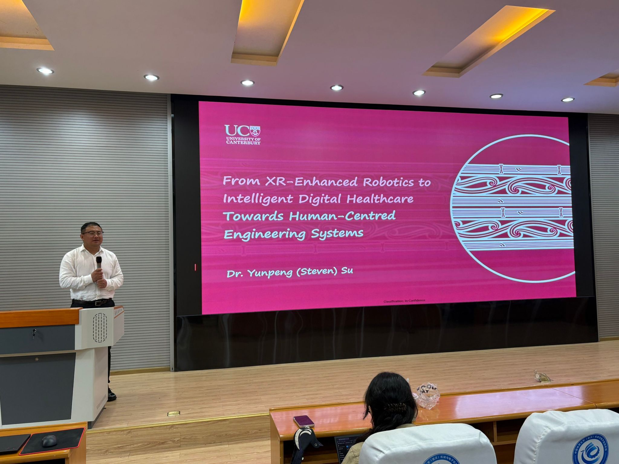 随后,新西兰坎特伯雷大学博士后苏云鹏作《从扩展现实(XR)增强机器人到智能数字医疗:迈向以人为中心的工程系统》主题报告。他介绍了在新西兰的求学科研经历,分享了混合现实与机器人远程遥操作系统、数字孪生在医疗领域的研究成果,以及国际合作情况和创业大赛获奖佳绩,还结合海外经历分享人生感悟,鼓励大家勇敢追梦、妥善处理人际关系,为师生带来诸多启发。