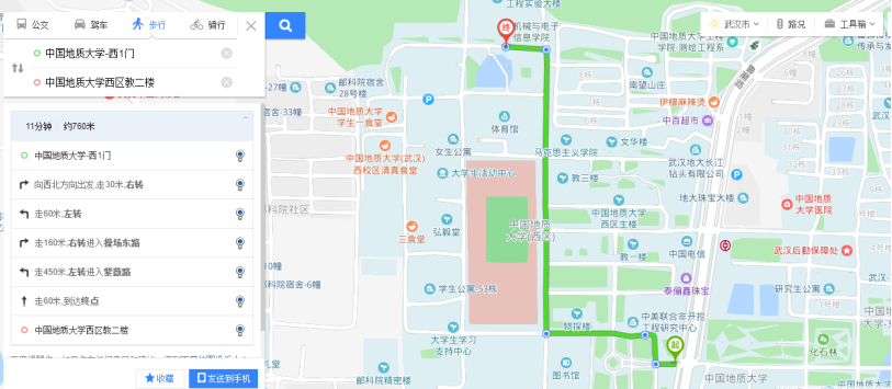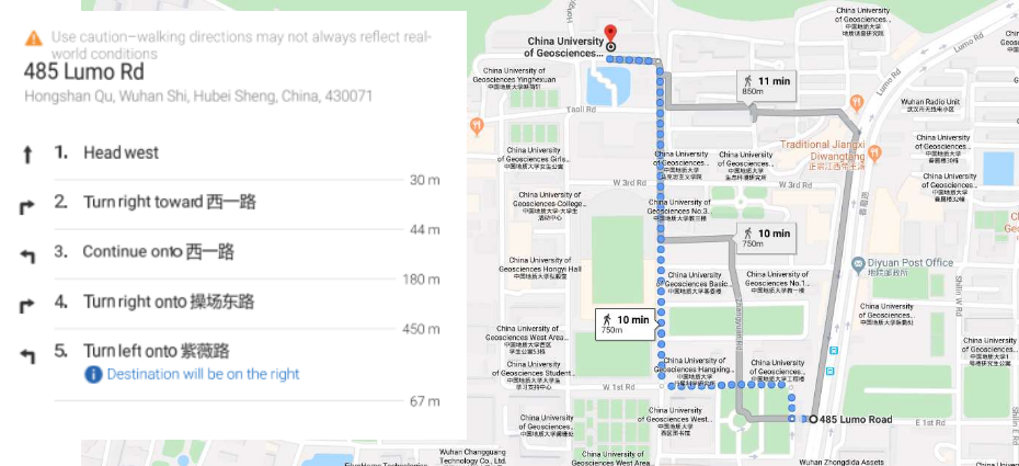 From China University of Geosciences West Gate 1 to China University of Geosciences West Area Teaching Building 2