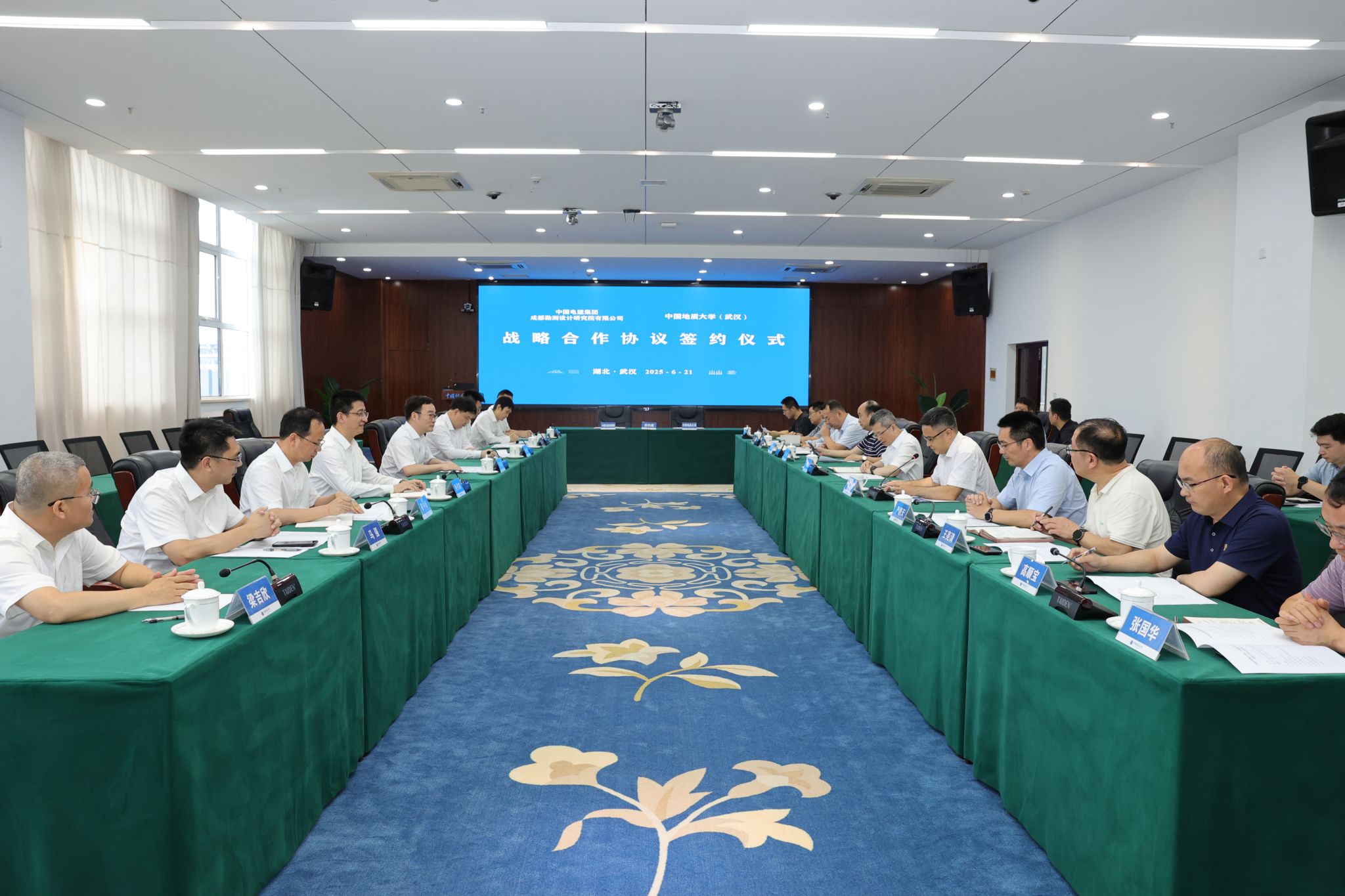 地大新闻网讯 6月21日,beat365官网与中国电建集团成都勘测设计研究院有限公司(以下简称“成都院”)签署战略合作协议。成都院党委书记、董事长何彦锋,党委副书记、总经理张世殊,副总经理乔月宾;beat365官网校长李建威、副校长王力哲,双方相关单位负责人参加会议。王力哲主持会议。