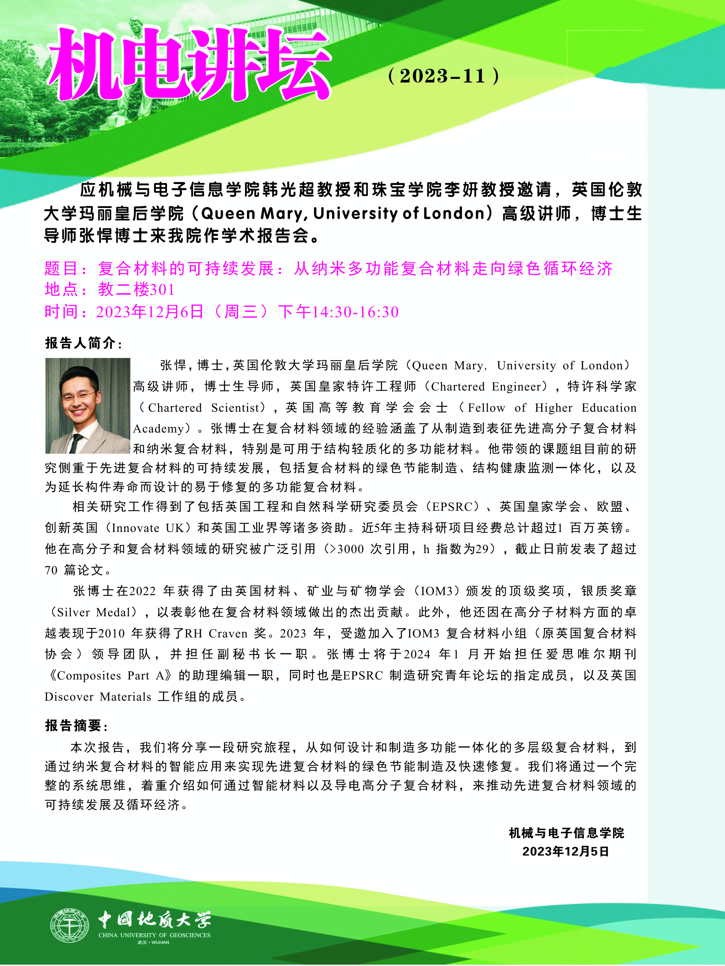 【12月6日】机电讲坛(2023-11):英国伦敦大学玛丽皇后学院张悍博士来beat365官网作学术报告会