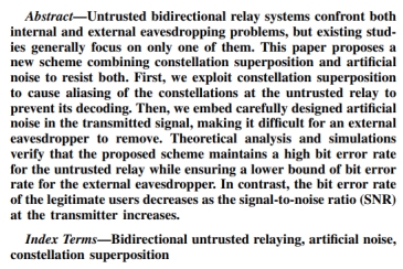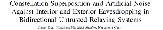 近日,beat365唯一官方网站通信系2022级本科生赵家伟以第一作者在IEEE国际知名期刊IEEE Wireless Communications Letters发表题为“Constellation Superposition and Artificial Noise Against Interior and Exterior Eavesdropping in Bidirectional Untrusted Relaying Systems”的学术论文。该论文提出了基于人工噪声的星座叠加技术,为双向中继系统对抗来自内部和外部的非法窃听提供了创新性解决方案。论文的指导教师为通信系特任副教授贺宏亮。
