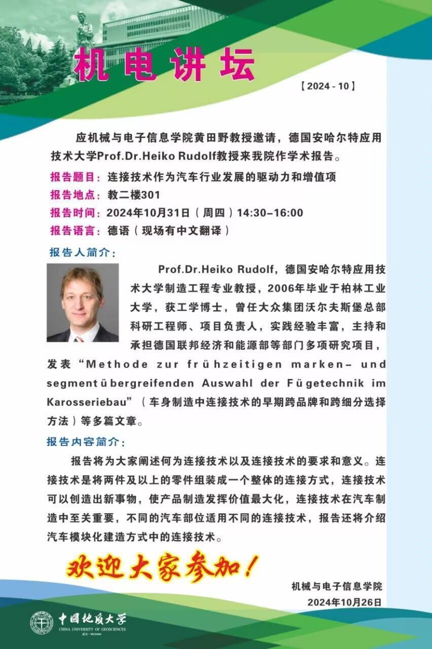 【10月31日】机电讲坛(2024-10):德国安哈尔特应用技术大学Prof.Dr.Heiko Rudolf教授来beat365官网作学术报告