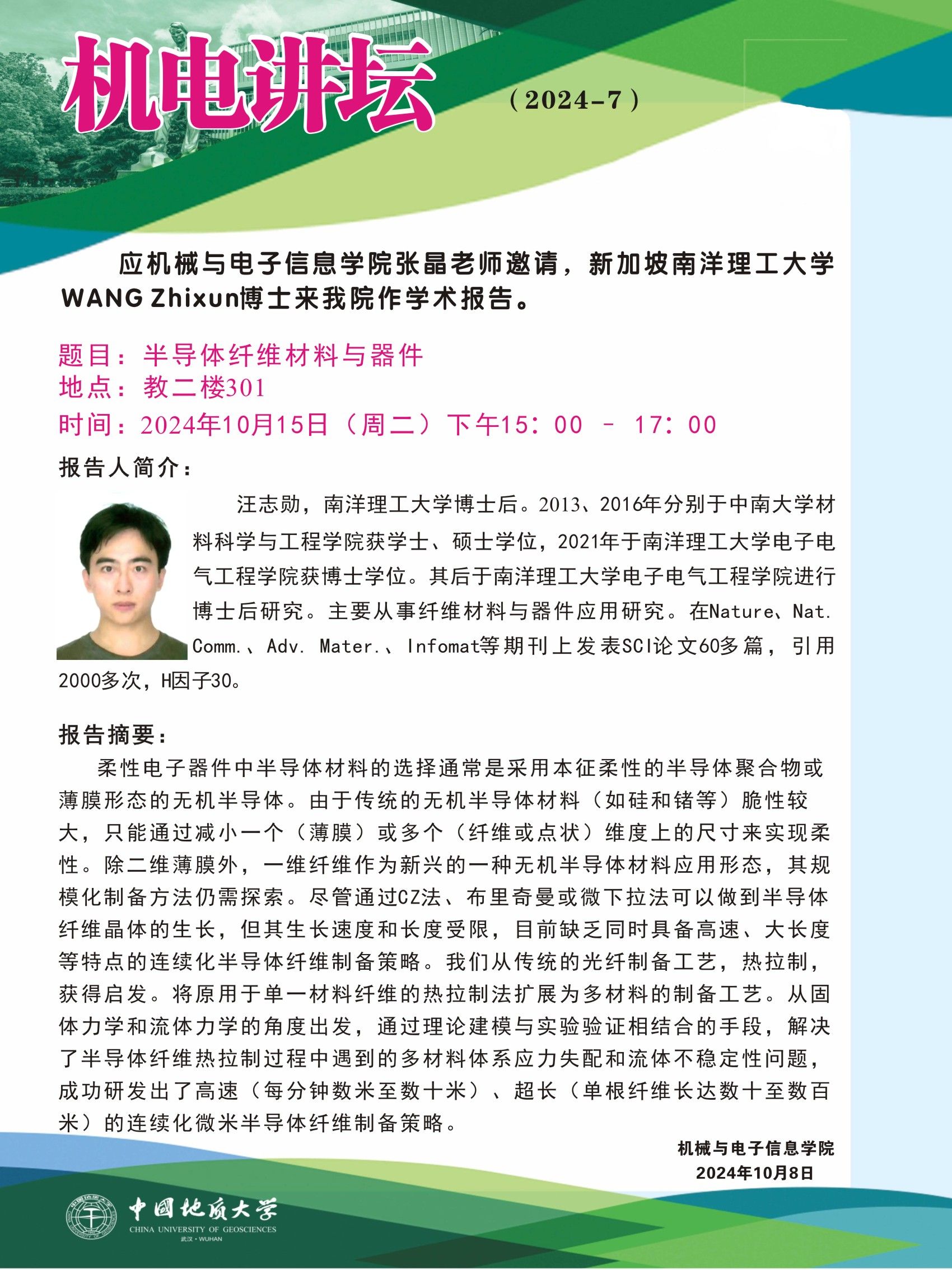 【10月15日】机电讲坛(2024-7):新加坡南洋理工大学WANG Zhixun博士来beat365官网作学术报告