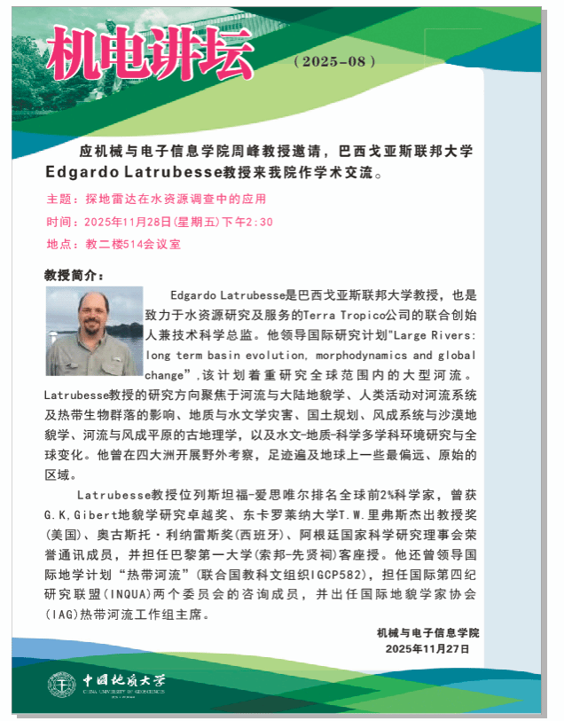 【11月28日】机电论坛(2025-08):巴西戈亚斯联邦大学Edgardo Latrubesse教授来beat365官网作学术交流