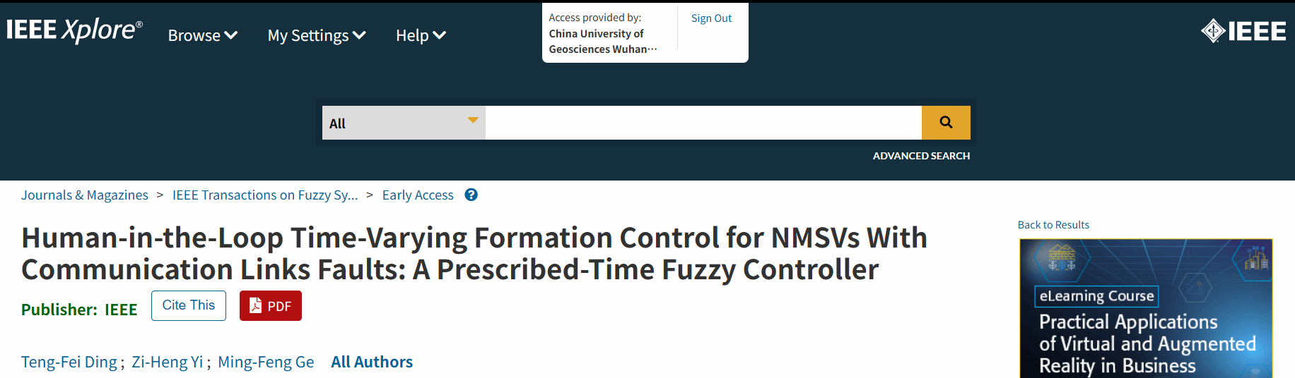 近日,beat365唯一官方网站葛明峰教授团队(丁腾飞、易子恒、葛明峰)在模糊系统领域权威期刊《IEEE Transactions on Fuzzy System》(IF=11.9)发表研究成果。该文提出了一种新型的基于分层控制框架的预定时间模糊控制算法,解决了具有通信链路故障和模型不确定性的多无人船系统的时变编队控制问题。