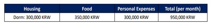 4. 费用:免学费,住宿费学院按照6000元人民币/人(安山校区)、12000元人民币/人(首尔校区)标准予以资助,其他费用自理。